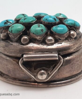 A wonderful old Navajo weaving! The weaver observed designs and letters, almost certainly from a tea tin, but she adapted the symbols for her use. “Tea” and “Net” both fit but she split “Wei ght” to make the letters fit her design. This weaving is featured in the book “Navajo Pictorial Weaving 1880-1950, Folk Art Images of Native Americans” by Tyrone Campbell and Joel and Kate Kopp, on page 117. The authors dated this rug to 1915-1925. The rug measures 74″ x 48″ and is in outstanding condition for its age.