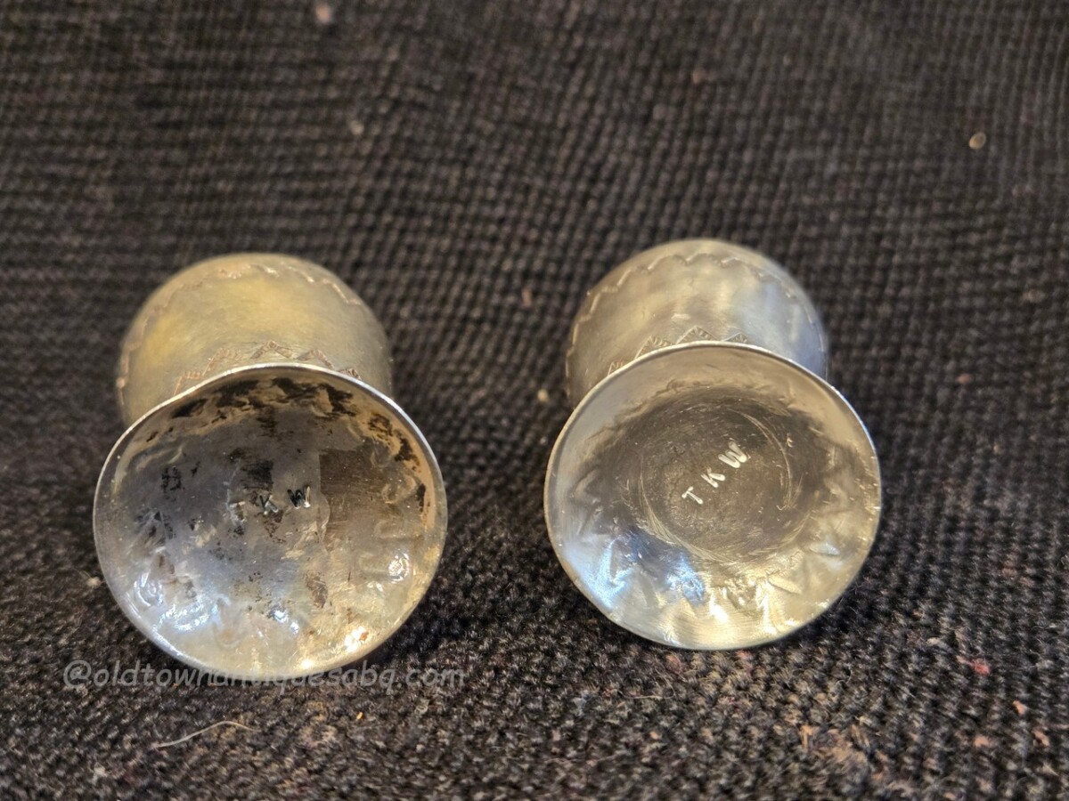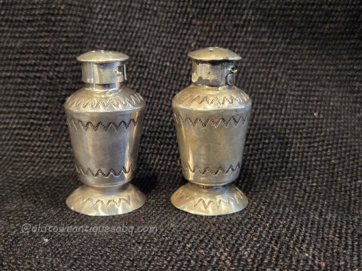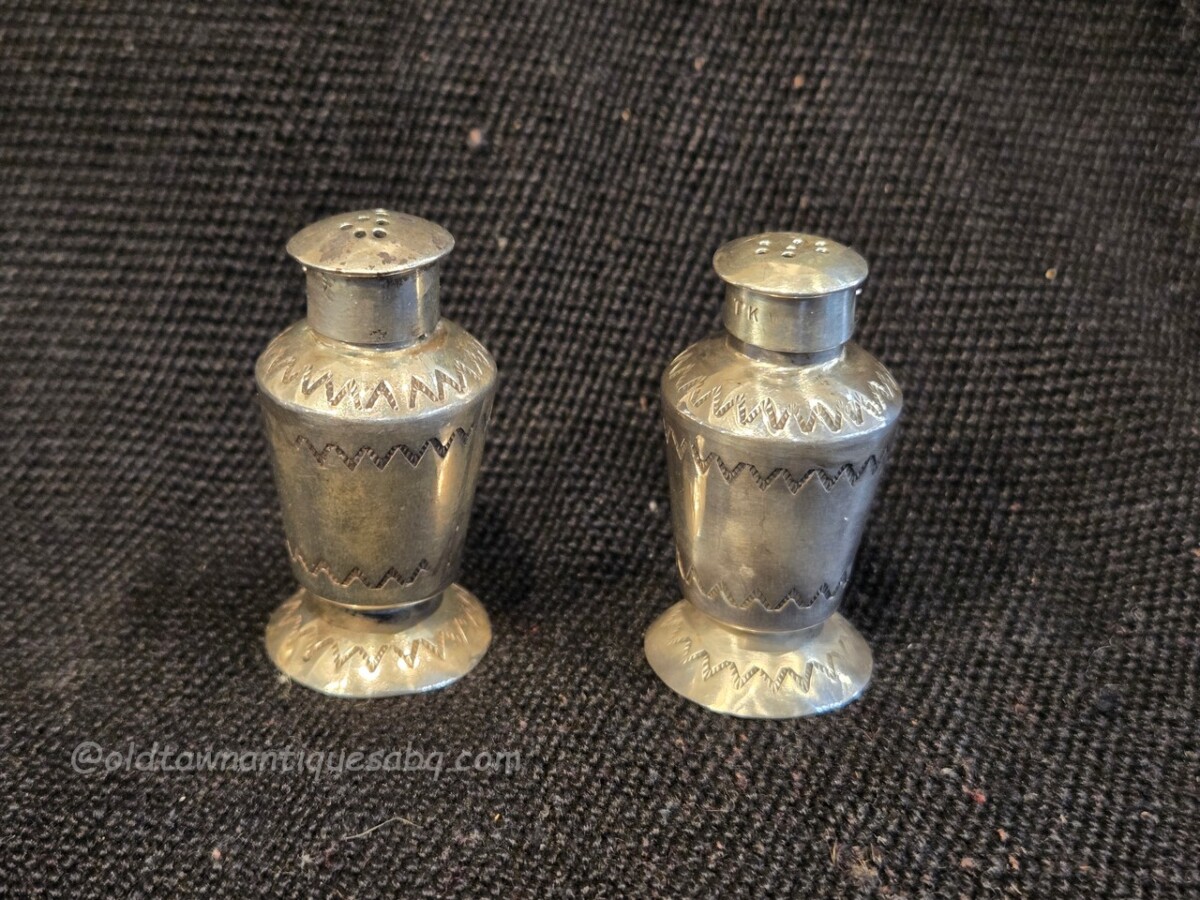 A pair of nifty stamped silver Navajo salt & pepper shakers. These were in the collection of an employee of the Fred Harvey Company. The lids of each are drilled in the form of an “S” and “P.” The lids fit well. Each shaker measures 1 3/4″ tall x 1″ wide. Marked on the underside, “T K W.” In very good old condition, useable!